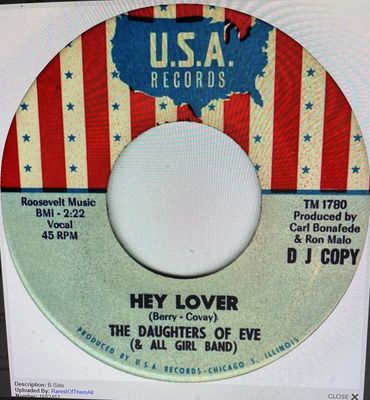 The Daughters of Eve was managed by Chicago Radio icon, Carl Bonafede (The Screaming Wildman), also known for introducing the Buckinghams to teenage audiences everywhere. The Daughters of Eve toured nationally and were especially popular in performances for U.S. Service personnel, and teenage dances across the Midwestern United States. From 1965 to 1968 the band always consisted of founders Debi (drums) Pomeroy, Marsha (guitar, keyboards, vocals) Tomal, and Judy Johnson (guitar, vocals). Bass players included founding player, Andrea Levin (1965-1966), Marylou Davidson (1966-1967), and Lori Wax (1967-1968).